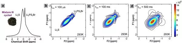 b-d. 樣品處理階段Ⅲ的電極-電解質(zhì)混合物經(jīng)循環(huán)充放電后對(duì)應(yīng)的二維7Li - 7Li固態(tài)核磁交換譜。(500ms后才出現(xiàn)明顯的鋰離子交換“對(duì)角線外反十字峰”,表明循環(huán)充放電過(guò)程破壞了界面接觸,影響了鋰離子傳輸)