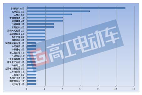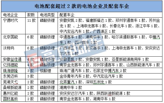 (一)本次入選的動(dòng)力電池來(lái)自25家企業(yè),其中前5名配套總數(shù)一共占據(jù)了31款,占比達(dá)52.54%。這5家企業(yè)分別為:寧德時(shí)代(11款)、北京國(guó)能(6款)、沃特瑪(6款)、安徽益佳通(4款)、億緯鋰能(300014)(4款)。