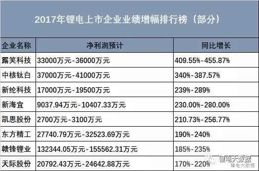 鋰電大數(shù)據(jù)點(diǎn)評(píng):2017年鋰電行業(yè)業(yè)績喜人,得益于新能源政策的落實(shí),多方資本涌入,投資擴(kuò)產(chǎn)成常態(tài), 從前三季業(yè)績預(yù)告來看,最后一季度的成績表還會(huì)有大幅變化,近百倍的增長都會(huì)出現(xiàn),幾十倍是普遍,2倍以上的增長并不算多。