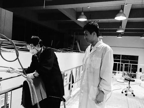 郭守武(右)與研究人員正在通宵做實(shí)驗(yàn)。