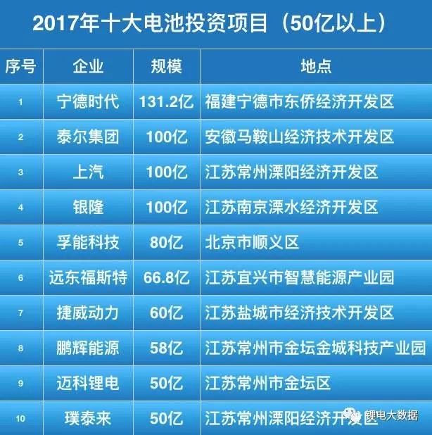 中國儲能網(wǎng)訊:受到新能源汽車快速發(fā)展的影響,2017年鋰電行業(yè)資本動作頻頻,新建、擴產(chǎn)項目投資火爆,下面盤點了2017年超過50億的投資項目。