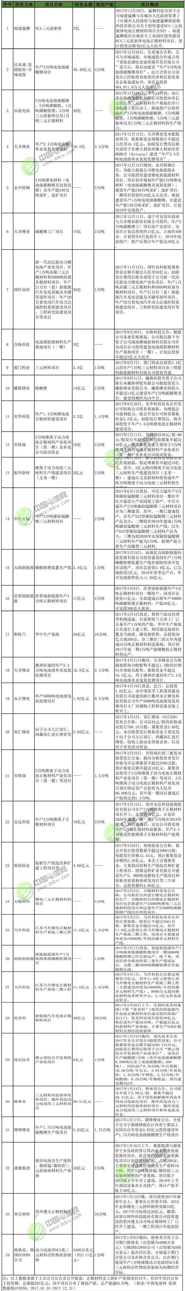 2017年1月-2017年12月正極材料及上游礦產資源項目投資情況統(tǒng)計表