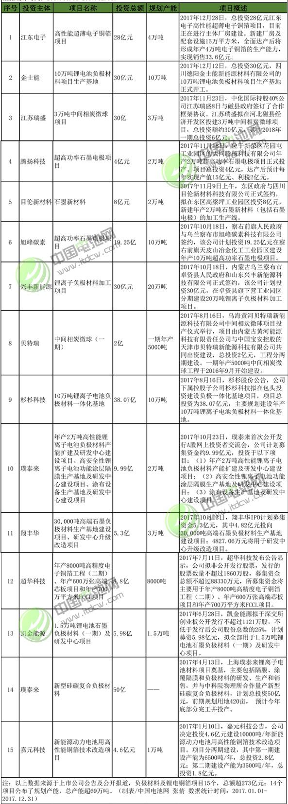 2017年1月-2017年12月負極材料及鋰電銅箔項目投資情況統(tǒng)計表