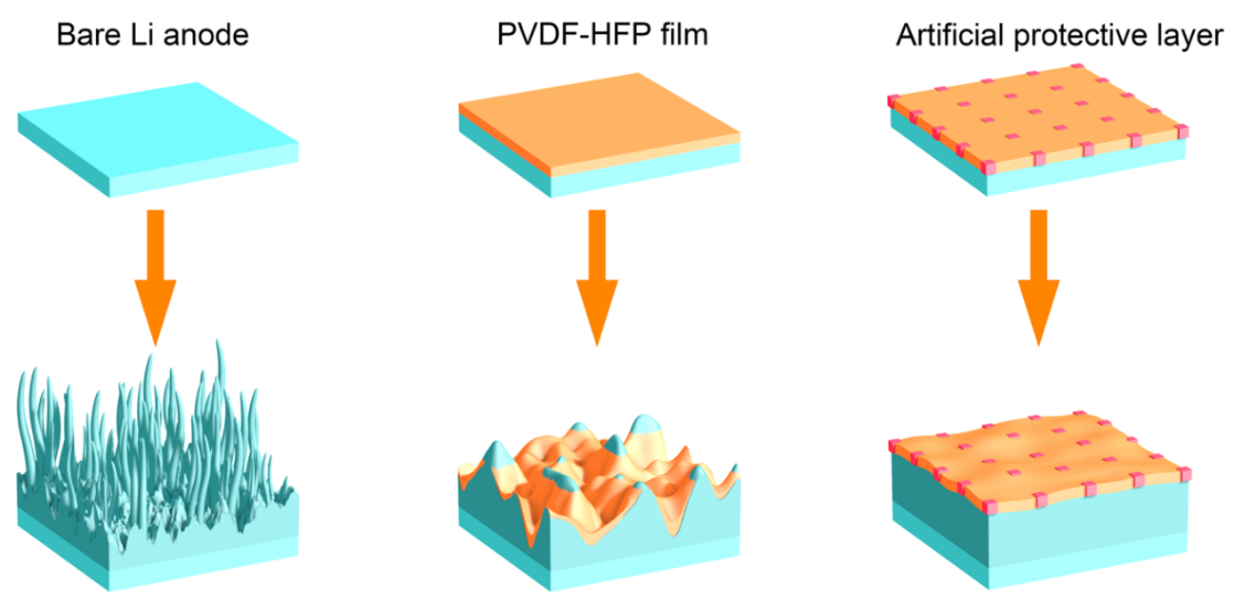 “剛柔相濟”的復合膜對界面進行修飾后,可有效依附于金屬鋰表面,并抑制枝晶生長的示意圖
