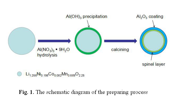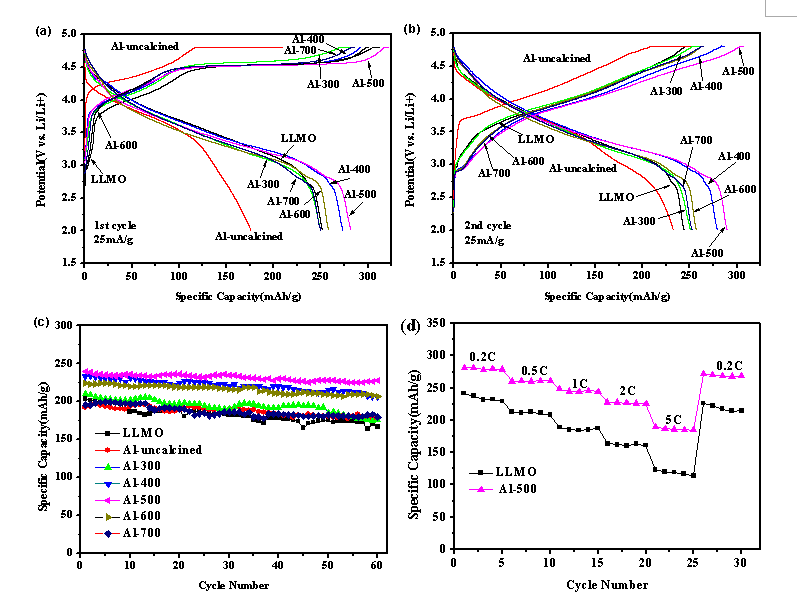 近期,梁逵教授團(tuán)隊碩士研究生文曉峰研究發(fā)現(xiàn)采用九水硝酸鋁溶液對富鋰錳正極材料處理并煅燒后,可以把它的表層層狀結(jié)構(gòu)轉(zhuǎn)變?yōu)榧饩Y(jié)構(gòu),并在尖晶石結(jié)構(gòu)外包覆一層氧化鋁。尖晶石結(jié)構(gòu)具有3D鋰離子運(yùn)輸通道,大大提高了鋰離子的傳導(dǎo)速率,從而提高材料的倍率性能;同時氧化鋁包覆層可以隔絕活性材料與電解液的直接接觸,避免了電解液對活性材料的損害,提高循環(huán)性能。這種處理方法工藝簡單,對設(shè)備要求低,可以同時提高富鋰錳正極材料的倍率性能和循環(huán)性能。經(jīng)過改性處理后,富鋰錳正極材料在250mA/g的電流密度下放電容量可高達(dá)240mAh/g,在1250mA/g的大電流下放電容量仍能達(dá)到190mAh/g。
