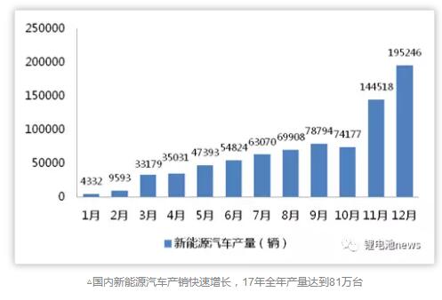 隨著新能源汽車推薦目錄的月度更新成為常態(tài),行業(yè)重回正軌;根據(jù)節(jié)能與新能源汽車網(wǎng)數(shù)據(jù)我國(guó)2017年新能源汽車產(chǎn)量達(dá)到81萬臺(tái),同比增長(zhǎng)接近60%;其中12月單月產(chǎn)量達(dá)到19.5萬臺(tái),創(chuàng)歷史新高。