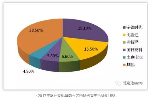 根據(jù)數(shù)據(jù)顯示,我國(guó)動(dòng)力電池2016年出貨量28.04GWh,市場(chǎng)前五名份額占有率累計(jì)達(dá)到72.6%;根據(jù)高工鋰電數(shù)據(jù)顯示,我國(guó)2017年動(dòng)力電池裝機(jī)量約為36.39GWh,其中前五名市場(chǎng)占有率下降為61.5%。