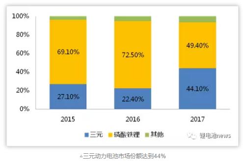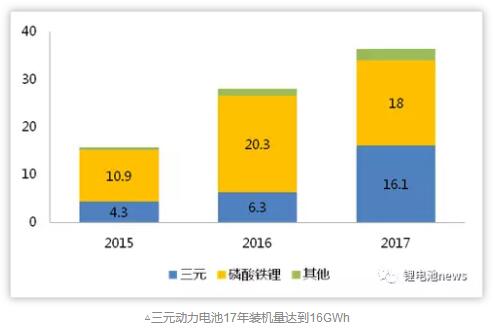 根據(jù)節(jié)能與新能源汽車網(wǎng)合格證數(shù)據(jù)顯示,我國(guó)2017年動(dòng)力電池裝機(jī)量約為36.39GWh,其中三元?jiǎng)恿﹄姵匮b機(jī)量16.05GWh,同比增長(zhǎng)155%;占比達(dá)到44%,市場(chǎng)占有率實(shí)現(xiàn)翻倍增長(zhǎng)。