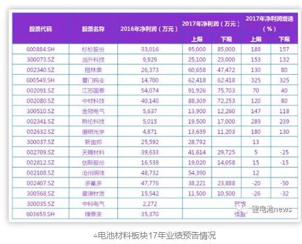 鋰電池材料領(lǐng)域共17家企業(yè)發(fā)布17年業(yè)績(jī)預(yù)告,其中12家預(yù)增(8家增速超過100%),2家預(yù)減,3家與16年基本持平。
