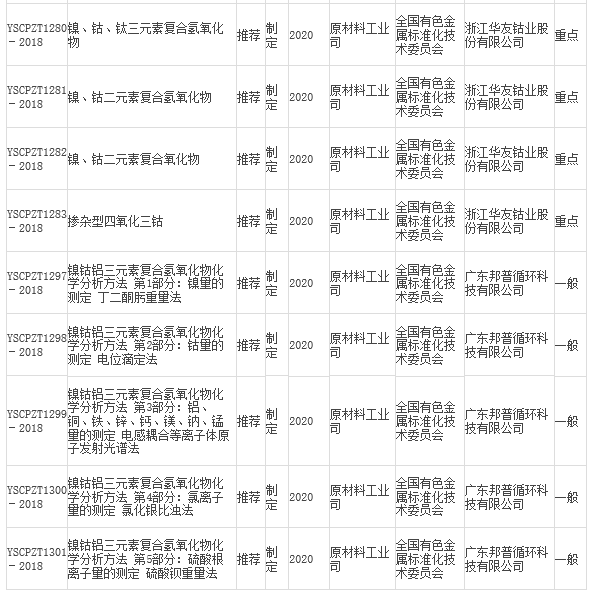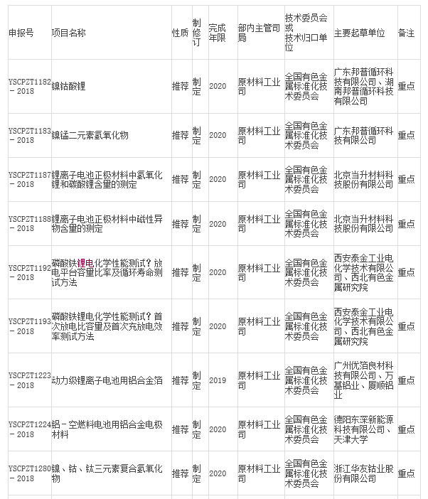 中國(guó)儲(chǔ)能網(wǎng)訊:2月1日,工信部公示了2018年第一季度行業(yè)標(biāo)準(zhǔn)制修訂計(jì)劃(征求意見稿),其中在有色行業(yè)標(biāo)準(zhǔn)項(xiàng)目計(jì)劃表中,包含了多項(xiàng)鋰離子電池正極材料及前驅(qū)體相關(guān)標(biāo)準(zhǔn)的制修訂計(jì)劃,共17項(xiàng)(見下表)。