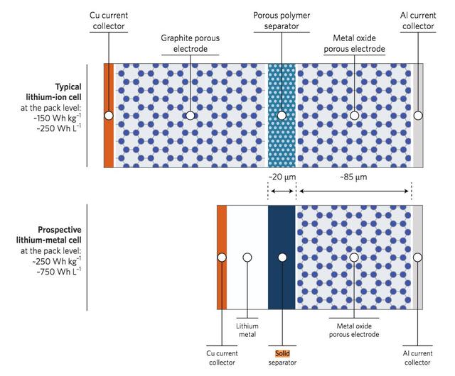 根據Nature的文章,金屬鋰電極可以使鋰電池的能量提高35%,能量密度提高50%。這可能會讓一個電池可以提供350或400瓦時每千克或1000瓦時每升的電能。