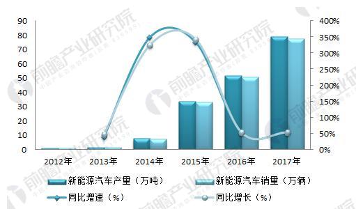 新能源汽車作為動力鋰電池的重要應用領域,其行業(yè)發(fā)展需求將對鋰電池行業(yè)有較大的影響。2012-2017年,我國新能源汽車產銷量上升趨勢明顯,以2015年為最大的產銷增速,在增量供應增加的影響下,2016年后行業(yè)趨于平穩(wěn)上升發(fā)展。2017年我國新能源汽車的產銷規(guī)模分別為79.4萬輛和77.7萬輛,增速均超過50%。新能源汽車呈現供過于求的發(fā)展局面,但總體而言供求趨于平衡。