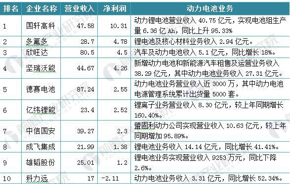 2016年國內涉及動力鋰電池業(yè)務的十家上市企業(yè)公布了其公司的經營狀況及動力鋰電池的業(yè)務規(guī)模,其中國軒高科動力鋰電池營業(yè)收入40.75億元,占營業(yè)收入比重的85.64%,同比增長90.84%。堅瑞沃能動力電池業(yè)務實現營業(yè)收入27.31億元。中信國安旗下盟固利動力公司實現營業(yè)收入10.63億元,比上年同期增長95.89%。成飛集成鋰電池業(yè)務收入14.14億元,同比增長41.41%。再過家政策及下游需求的推動下,經營動力鋰電池的企業(yè)應注重電池性能的研發(fā)及推廣應用,以提升公司的綜合競爭力。