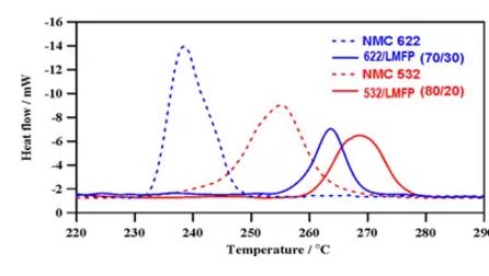 三元+LMFP的作法已被許多電池廠認(rèn)證,三元混摻20%~30%LMFP的復(fù)合材料與純?nèi)牧舷啾?,熱分解溫度提?~10%且放熱量降低40~60%(如圖一所示),證實(shí)可從材料的本質(zhì)徹底解決三元一直以來存在的安全問題,動(dòng)力電池產(chǎn)業(yè)如今要從523轉(zhuǎn)向安全疑慮更高的622及811,若只靠政策的松綁,終究是不能解決安全的問題。此問題一日未解,始終會(huì)是一顆未爆彈,SONY、三星的慘痛代價(jià)仍記憶猶新,作為企業(yè)的領(lǐng)導(dǎo)者不得不謹(jǐn)慎以對(duì)。