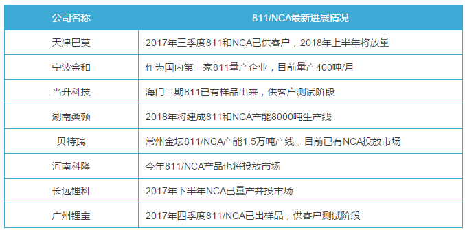 目前我國國內(nèi)三元材料廠家811/NCA型材料生產(chǎn)進(jìn)展到底如何了呢?小編借此來盤點(diǎn)一下: