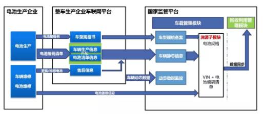 建設方案中指出,盡快建立并完善“新能源汽車國家監(jiān)測與動力蓄電池回收利用溯源綜合管理平臺”,由汽車生產(chǎn)企業(yè)直接將動力蓄電池編碼信息上傳至“車載管理模塊”(原國家監(jiān)管平臺升級)?!豆芾磙k法》中明確要求,電池生產(chǎn)企業(yè)與汽車生產(chǎn)企業(yè)應及時上傳動力蓄電池編碼及新能源汽車相關信息,同時新能源汽車售后服務機構(gòu)、電池租賃等運營企業(yè)也應盡快建立動力蓄電池編碼與新能源汽車的動態(tài)聯(lián)系。