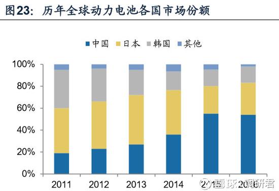日本是動力電池行業(yè)發(fā)展的先驅(qū),早在1995年豐田公司的鎳氫鋰電池便已應(yīng)用于普銳斯混動動力汽車,隨后形成了近10年日本對于鋰電池行業(yè)主導(dǎo),市場占比曾一度達(dá)全球的80%;隨后, 韓國三星SDI、LG化學(xué)分別于2008年、2009年進(jìn)入動力電池市場,與本國汽車廠商現(xiàn)代、起亞展開深度合作,挑戰(zhàn)日本鋰電池行業(yè)主導(dǎo)地位,2011年韓國在動力電 池領(lǐng)域全球份額已達(dá)到35%,與日本僅有6個百分點(diǎn)的差距;2014年起中國新能源汽車產(chǎn)業(yè)爆發(fā),帶動中國本土動力電池產(chǎn)量成倍增長,2015年中國便成為了動力電池世界第一生產(chǎn)國,全球市場份額約55%。