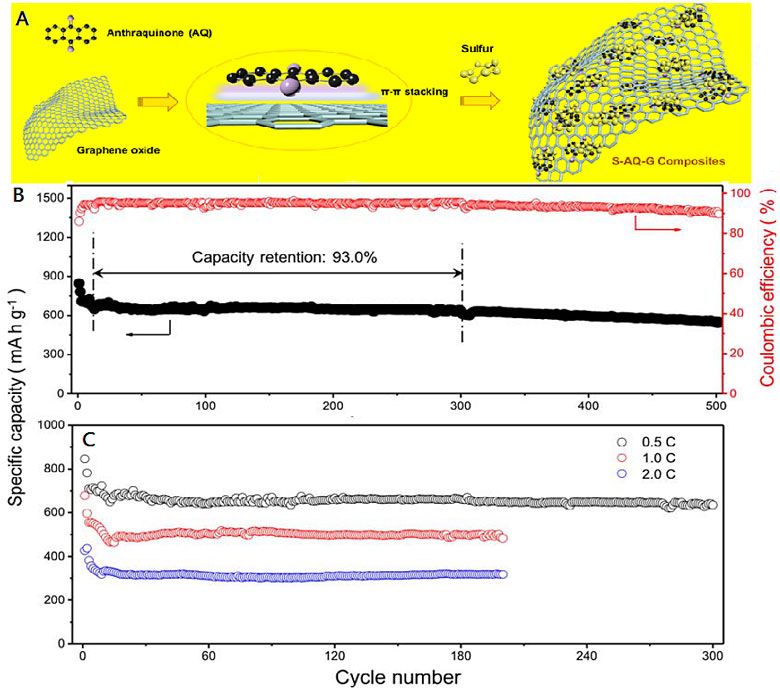 圖1A是蒽醌/石墨烯/硫復合正極材料制備的示意圖,圖1B和1C是鋰硫電池的充放電性能測試圖。從圖可知,蒽醌/石墨烯/硫復合正極材料具有極其穩(wěn)定的循環(huán)能力,在300圈循環(huán)內,平均每圈容量僅降低0.019%;0.5C充放電500圈后,總容量仍保持在初始容量的81%以上。這種穩(wěn)定的充放電行為意味著天然豐富的蒽醌(AQ)小分子可以有效抑制中間多硫化物的溶解及流失。