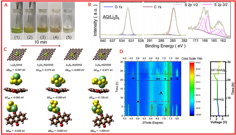 圖2.(A)多硫化鋰溶液中滴加蒽醌分散液的溶液顏色變化圖;(B)多硫化鋰-蒽醌復合物的XPS成像;(C)密度泛函理論計算及(D)多硫化鋰-蒽醌復合物的原位X射線表征。