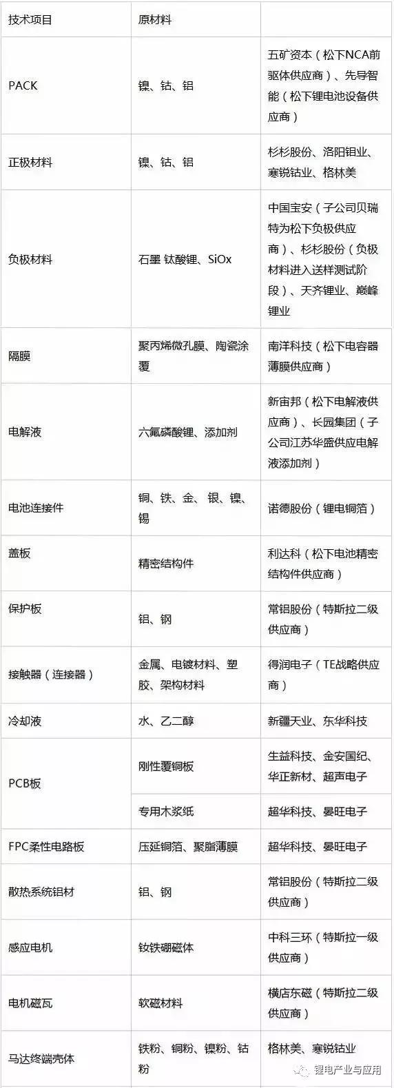 松下產(chǎn)電池正極材料供應(yīng)商為住友(Sumitomo),而鎳、鈷、鋁等原材料供應(yīng)商則是來自中國的杉杉股份、洛陽鉬業(yè)、寒銳鈷業(yè)和格林美四家公司;