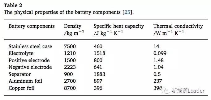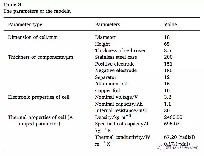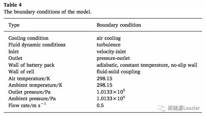 Quan Xia采用了A123的LiFePO4電池對上述模型進(jìn)行了驗(yàn)證,電池組采用了3并5串的結(jié)構(gòu),電池組的一些熱特性參數(shù)如下表2所示,模型的參數(shù)如下表3所示,模型的邊界條件如下表4所示。