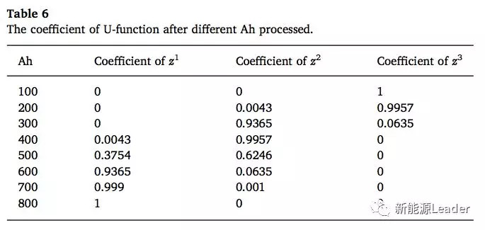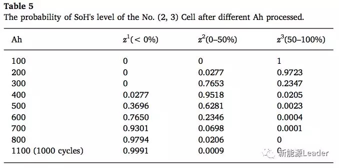 下圖為電池組的仿真結(jié)果,圖b為電池組內(nèi)的溫度分布,圖c為電池組內(nèi)散熱媒介的流動(dòng)速度分布。根據(jù)電池組內(nèi)的溫度分布,就可以根據(jù)式(11)計(jì)算出的到不同單體電池的容量衰降,并據(jù)此計(jì)算單體電池的健康狀態(tài)。我們以電池組中最中間的一只電池(2,3)為例,計(jì)算了循環(huán)不同的周期后電池衰降到不同狀態(tài)的概率,如下表5所示??梢钥吹皆诮?jīng)過1000次循環(huán)后該電池失效的幾率達(dá)到0.9991。整個(gè)電池組在不同的循環(huán)時(shí)間后失效的概率如下表6所示,可以看到在經(jīng)過500Ah充電后,電池組失效的概率為0.3754,在充電700Ah后電池組的失效概率達(dá)到0.999。