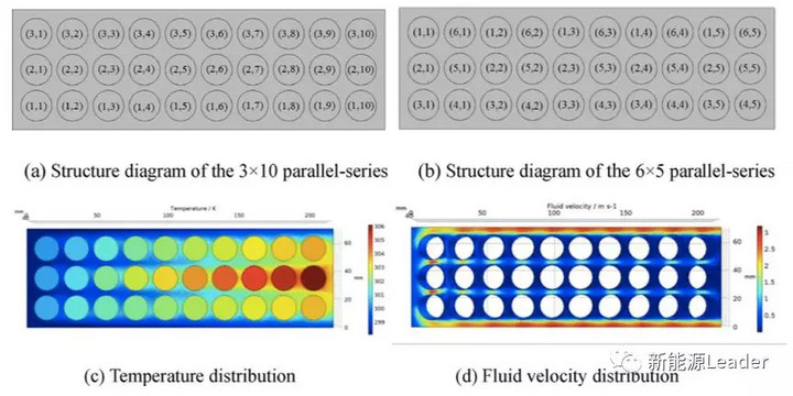 電池組的備份形式主要分為熱備份、冷備份和熱待機(jī)三種形式,這里我們探討一下電池組熱備份的情況下電池組的可靠性分析。熱備份也可以分為兩種類型:“并聯(lián)”或者“串聯(lián)”。下圖a和b分別展示了“串聯(lián)”備份(3并10串)和“并聯(lián)”備份(6并5串)兩種模式的電池結(jié)構(gòu),并通過調(diào)節(jié)電池組的工作電流保證兩種備份模式下電池組中的單體電池的工作電流相同。因此兩種備份模式下,電池組的溫度分布和散熱媒介的速度分布也是相同的,如下圖的c和d所示。那么這兩種備份模式對于鋰離子電池組的可靠性會產(chǎn)生什么影響嗎?