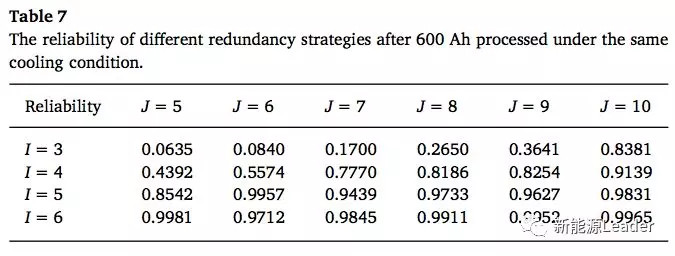 下圖展示了上述的兩種備份模式下,鋰離子電池的可靠性隨著時(shí)間變化的曲線,從圖中我們可以看到在經(jīng)過600Ah充電后,沒有備份的3并5串電池的可靠性下降到了0.0635,而有備份的電池組可靠性明顯上升,3并10串電池組的可靠性為0.8381,6并5串電池組的可靠性高達(dá)0.9981,其他的備份方式的電池組可靠性如下表所示。從計(jì)算結(jié)果來看,不同的備份模式會對電池組的可靠性產(chǎn)生顯著的影響,在備份電池?cái)?shù)量相同的情況下,并聯(lián)備份能夠顯著的提高電池組的可靠性。但是我們也需要注意簡單的增加備份電池的數(shù)量并不能提高電池組的可靠性,例如同樣在6并的情況下,隨著串聯(lián)電池?cái)?shù)量的增加,會出現(xiàn)可靠性降低的情況,這主要是因?yàn)殡S著串聯(lián)電池?cái)?shù)量的增加,會導(dǎo)致溫度分布的變化,進(jìn)而降低電池組的可靠性。