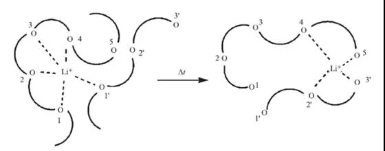 以PEO為例,該類(lèi)聚合物的電解質(zhì)傳輸機(jī)制如上圖所示,通電以后,聚合物中非晶部分的鏈段運(yùn)動(dòng)導(dǎo)致Li+的“解絡(luò)合—再絡(luò)合”過(guò)程的反復(fù)進(jìn)行而促使離子實(shí)現(xiàn)快速遷移。