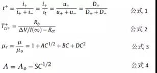 其中,μr是相對(duì)粘度,μ是溶液粘度,μ0是純?nèi)軇┱扯龋珻是鋰鹽濃度,A、B、D是系數(shù),Λ是摩爾電導(dǎo)率,Λ0是在無(wú)限稀釋狀態(tài)下的摩爾電導(dǎo)率,S是受溶劑物理性質(zhì)和電解質(zhì)性質(zhì)影響的參數(shù),C是溶質(zhì)濃度。如果鋰鹽和溶劑的種類(lèi)變化之后,經(jīng)驗(yàn)公式也需要進(jìn)行修改。對(duì)于混合體系電解液來(lái)說(shuō),公式會(huì)更加復(fù)雜。