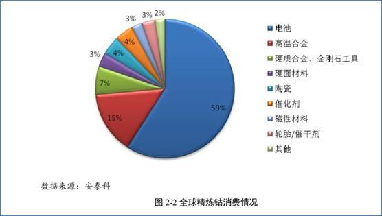 就金屬鈷而言,據(jù)安泰科數(shù)據(jù)顯示,2017年全球鈷消費(fèi)約為11.5萬金屬噸,同比增長接近11%。其中,電池行業(yè)占比高達(dá)59%。