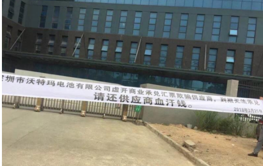 在深圳市坪山新區(qū)的工業(yè)園中,沃特瑪總部大樓屬于非常顯眼的建筑,高高懸掛在大樓上方的沃特瑪三個(gè)大字,宣告著它往日的輝煌。但是,在《中國(guó)汽車報(bào)》記者面前,緊緊關(guān)閉的伸縮門與筆直站立并不斷觀察周圍情況的保安又讓人不得不面對(duì)現(xiàn)實(shí)。3月25日,供應(yīng)商正是圍堵這座大門,并拉出“深圳市沃特瑪電池有限公司虛開商業(yè)承兌匯票欺騙供應(yīng)商,到期無(wú)法承兌,請(qǐng)還供應(yīng)商血汗錢”的橫幅,場(chǎng)面堪稱混亂。
