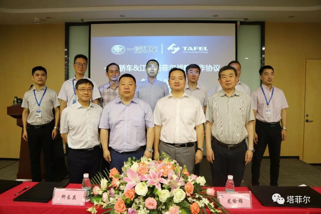 中國(guó)儲(chǔ)能網(wǎng)訊:2018年6月8日,一汽轎車股份有限公司(以下簡(jiǎn)稱“一汽轎車”)與江蘇塔菲爾新能源科技股份有限公司(以下簡(jiǎn)稱“塔菲爾”)在南京舉行戰(zhàn)略合作簽約儀式。中國(guó)第一汽車股份有限公司總經(jīng)理助理、奔騰事業(yè)部本部部長(zhǎng)、一汽轎車總經(jīng)理柳長(zhǎng)慶先生與塔菲爾新能源科技董事長(zhǎng)兼總裁龍繪錦先生出席并代表公司簽署了戰(zhàn)略合作協(xié)議。