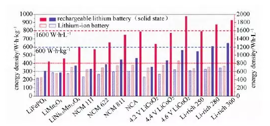 2) 可逆容量達(dá)到300 mA·h/g 的富鋰錳基鋰電池的體積能量密度也可以超過1850 W·h/L,質(zhì)量能量密度甚至高于600 W·h/kg;