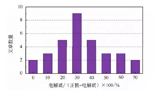 圖5. 2017 年發(fā)表的全固態(tài)鋰電池中固態(tài)電解質(zhì)與正極活 性材料加固態(tài)電解質(zhì)材料的質(zhì)量占比的文章數(shù)量統(tǒng)計