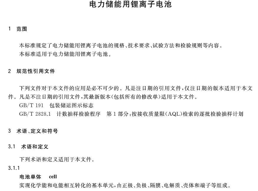 中國儲能網(wǎng)訊:《電力儲能用鋰離子電池》標(biāo)準(zhǔn)于2018-06-07發(fā)布,2019-01-01起開始實(shí)施。