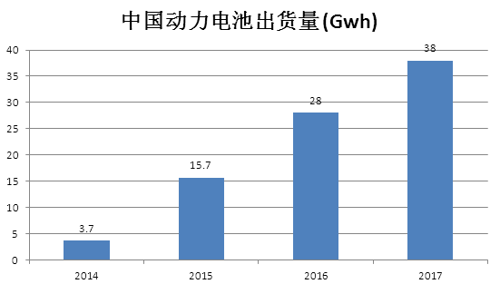 中國的汽車動(dòng)力鋰電池產(chǎn)業(yè)(EV LIB)從2014年3.7Gwh的出貨量,飛躍至2015年15.7Gwh,同比增長352%,2016年動(dòng)力電池出貨量28Gwh,同比增加79%。而去年也就是2017年中國汽車動(dòng)力鋰電池的出貨量已達(dá)到38.0Gwh,占全球汽車動(dòng)力鋰電池(EV LIB)出貨量的65.4%。
