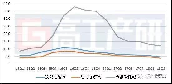 (1)市場(chǎng)價(jià)格競(jìng)爭(zhēng)加劇,市場(chǎng)盈利效應(yīng)減弱:電解液是鋰電池四大主材中成本最為透明的材料,主流電池企業(yè)對(duì)電解液議價(jià)能力較強(qiáng),加至市場(chǎng)上衢州杉杉新增六氟磷酸鋰及電解液產(chǎn)能釋放、低價(jià)搶占主流動(dòng)力電池企業(yè)訂單等因素影響,電解液市場(chǎng)在2018Q2價(jià)格競(jìng)爭(zhēng)激烈,三元型動(dòng)力電解液價(jià)格跌至3.5-4.2萬(wàn)元/噸。