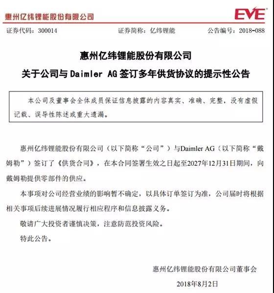 在這份簡單的公告中,未見具體的供貨零部件具體是哪些,從億緯鋰能的主營業(yè)務(wù)——鋰電池和戴姆勒的汽車業(yè)務(wù),不由讓人想象,供貨的零部件可能是新能源汽車的核心——動力電池。此前戴姆勒與比亞迪合作推出的騰勢汽車也從側(cè)面表明了戴姆勒與國內(nèi)電池廠商合作。