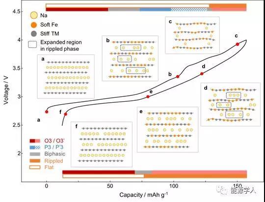 圖6. 含鐵鈉層狀化合物結(jié)構(gòu)演變的示意圖。此處以FC在2.5和4 V之間循環(huán)的充放電滯回曲線和對(duì)應(yīng)點(diǎn)a-f處的微觀結(jié)構(gòu)示意圖為例。六個(gè)插圖a-f是在電壓曲線上標(biāo)記出的相應(yīng)狀態(tài)下沿b方向的微觀結(jié)構(gòu)示意圖。(a) O3相中完全充滿的鈉層和平直的過渡金屬氧化物層。(b) 金屬氧化物層中的鐵離子逐漸被氧化并開始軟化。黑色虛線包含了將要在褶皺相中膨脹的區(qū)域和因此首先被提取出的鈉離子。(c) 鈉含量更低時(shí),過渡金屬層處于褶皺相。鐵離子被進(jìn)一步氧化,扭曲和軟化周圍環(huán)境。(d) 與(b)-(c) 過程中黑框內(nèi)的鈉離子首先被提取不同,放電時(shí)鈉離子將首先被插入到黑框區(qū)域中,導(dǎo)致了關(guān)于充放電不對(duì)稱的演化路徑。(e, f) 隨著鈉含量增加,金屬氧化物層又回到平直狀態(tài)。