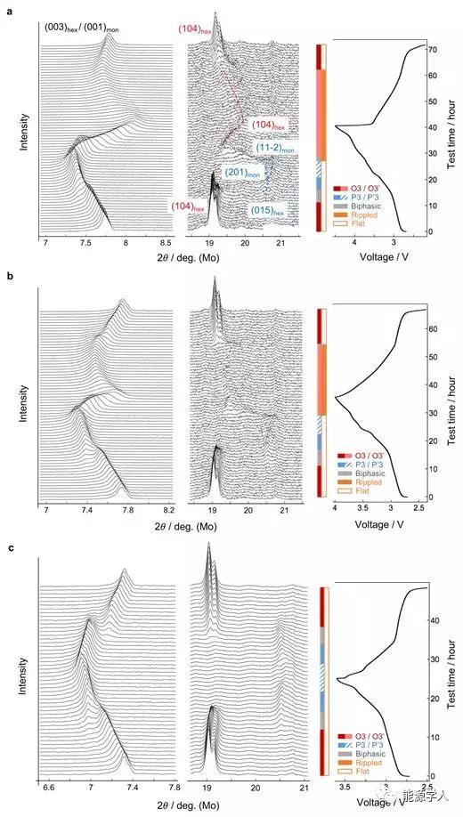 圖5. 對(duì)于FC在C / 50下截止電壓為 (a) 4.5V,(b) 4V, (c) 3.6V 的原位XRD測(cè)量以及對(duì)應(yīng)的電壓曲線和相圖。相分析的細(xì)節(jié)如 (a) 所示。對(duì)于(b)和 (c) 可進(jìn)行類似的分析。