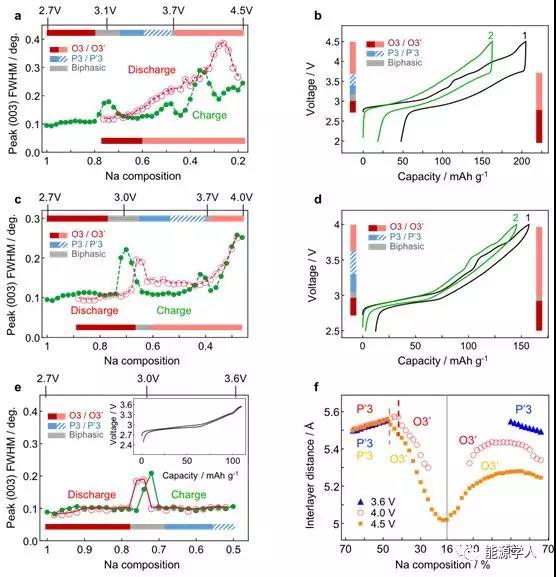 圖4. 不同電壓截止條件下Na[Fe0.5Co0.5]O2 (FC)的結(jié)構(gòu)演化和電壓滯回曲線 (a)FC在2V和4.5V之間循環(huán)的原位XRD (003)峰的半高寬數(shù)據(jù)和充電(頂部)和放電(底部)的關(guān)于鈉含量的相圖。(b) 相應(yīng)的截止電壓為4.5V的電池循環(huán)測(cè)試的第一和第二次循環(huán)的電壓曲線以及充電(左)和放電(右)的關(guān)于電壓的相圖。(c, d) 循環(huán)電壓范圍為2V到4.0V。其余同(a, b)。 (e) 循環(huán)電壓范圍為2V到3.6V。相演化對(duì)于充電和放電相同。插圖:高度對(duì)稱的第一個(gè)循環(huán)的電壓曲線。(f) (a), (c) 和 (e) 中每個(gè)原位XRD測(cè)量中層間距離的演變。原位XRD測(cè)試和電池測(cè)試的速率分別為C / 50和C / 10。注意這里P'3代表具有單斜變形的P3相,而O3'代表另一個(gè)O3相高壓,具有加寬的(003)XRD峰。