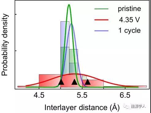 圖3. 根據(jù)HAADF-STEM圖像(圖2 d-f)中的實(shí)際強(qiáng)度分布測(cè)量得到的原始MFCN (綠色),充電至4.35 V(紅色),經(jīng)過一個(gè)電池循環(huán)周期后(藍(lán)色)的層間距離的分布。曲線是直方圖數(shù)據(jù)的均值和方差對(duì)應(yīng)的高斯分布。三個(gè)黑色三角形對(duì)應(yīng)于在褶皺結(jié)構(gòu)的DFT計(jì)算中的層間距離(圖1a)。