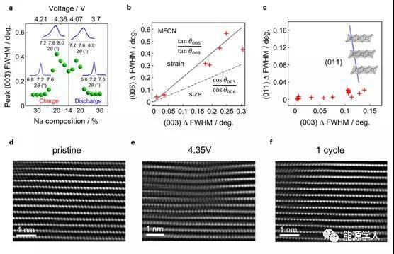 圖2. 通過原位XRD和球差校正的STEM觀察到褶皺相的相關(guān)現(xiàn)象。 (a) 原位XRD測(cè)量得到的 (003) 衍射峰的半高寬。以C / 50速率充電至4.5V的過程在約43小時(shí)結(jié)束,相應(yīng)的剩余鈉離子的標(biāo)稱值為14%。插圖從左到右是充電過程中在鈉含量為28%和18%時(shí)以及放電時(shí)相應(yīng)位置的(003)峰的實(shí)際XRD曲線。在圖上方邊緣標(biāo)出了對(duì)應(yīng)電壓值。 (b) 實(shí)測(cè)得到的 (003) 和 (006) XRD峰半高寬的角度依賴性與應(yīng)變展寬(實(shí)線)和尺寸展寬(虛線)相比較。每個(gè)紅色標(biāo)記對(duì)應(yīng)于原位XRD掃描結(jié)果,與應(yīng)變展寬模型十分接近。 (c) (011) 與 (003) 平面對(duì)應(yīng)的的XRD展寬對(duì)比。插圖中的模型指明了 (011) 平面的方向。說明在金屬氧化物面內(nèi)沒有明顯的應(yīng)變分量。 (d-f) 為MFCN在b方向的HAADF-STEM圖像。所使用的分別為樣品是 (d) 原始薄膜,(e) 以C / 10速率充電至4.35V和 (f) 在C / 10速率下2V至4.5V之間的一個(gè)循環(huán)之后。亮斑點(diǎn)表示過渡金屬離子的位置。