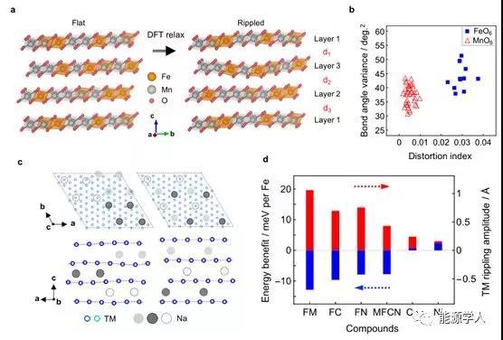 圖1. 對(duì)于自發(fā)褶皺相變的DFT計(jì)算。(a) 鈉層全空的O3型Fe0.25TM0.75O2從不穩(wěn)定的平直結(jié)構(gòu)經(jīng)過DFT弛豫到了褶皺結(jié)構(gòu)。 (b) 量化 (a) 中所示DFT弛豫得到的褶皺結(jié)構(gòu),F(xiàn)eO6的形變度顯著高于MnO6八面體。 (c) 在鈉層非空的情況下,具有不均勻分布(團(tuán)簇)鈉離子的結(jié)構(gòu)中也能觀察到褶皺現(xiàn)象,而在鈉離子均勻分布的情況下金屬氧化物層保持平直。(d)比較 (c) 中所述兩種情況,鈉團(tuán)簇與褶皺結(jié)構(gòu)耦合的狀態(tài)在各種不同鐵比例鈉層狀化合物均表現(xiàn)為低能態(tài),且褶皺的幅度總體隨著含鐵量增加而增強(qiáng)。對(duì)于x軸標(biāo)簽,從左至右分別代表Nax[Fe0.5Mn0.5]O2, Nax[Fe0.5Co0.5]O2,Nax[Fe0.5Ni0.5]O2,Nax[Mn0.25Fe0.25Co0.25Ni0.25]O2,NaxCoO2和NaxNiO2(x = 1/9)。