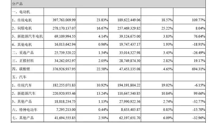 其中,碳酸鋰產(chǎn)品實現(xiàn)營收3.77億元,同比大增694.31%,占總營業(yè)收入比例為22.58%;而新能源汽車及新能源汽車電機業(yè)務(wù)分別實現(xiàn)營收2.21億元和6911萬元,同比增長99.66%和76.64%。