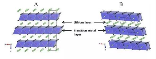 ▲圖1 LiMO2(A)和Li2MnO3(B)晶體結(jié)構(gòu)