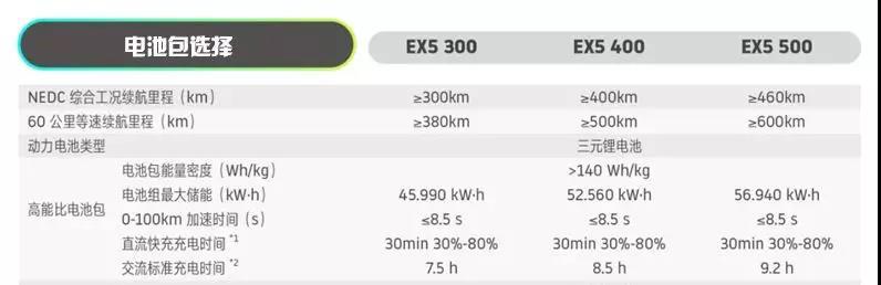 高工鋰電了解到,威馬EX5配有三種電池包供消費(fèi)者選擇,分別是EX5300、EX5400、EX5500,采用的是三元鋰電池,電池包系統(tǒng)能量密度均為140wh/kg。其中,三款電池包的續(xù)航均不同,主要是其電池容量差異化造成的。且看下圖。