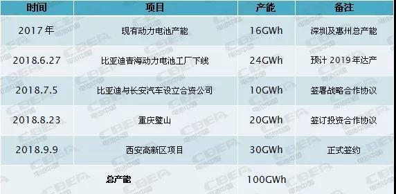 據(jù)電池中國網(wǎng)了解,截止到2017年年底,比亞迪動(dòng)力電池的總產(chǎn)能是16GWh,其中6GWh是三元電池,10GWh是磷酸鐵鋰電池;2018年6月27日,比亞迪規(guī)劃產(chǎn)能24GWh的青海動(dòng)力電池工廠正式下線,預(yù)計(jì)2019年全部投產(chǎn);7月5日,比亞迪與長安汽車簽署戰(zhàn)略合作協(xié)議,成立動(dòng)力電池合資公司,規(guī)劃產(chǎn)能10GWh;8月23日,比亞迪與重慶璧山區(qū)政府就動(dòng)力電池年產(chǎn)20GWh產(chǎn)業(yè)項(xiàng)目簽訂投資合作協(xié)議;9月9日,比亞迪30GWh動(dòng)力電池項(xiàng)目簽約儀式在西安高新區(qū)舉行。至此,比亞迪動(dòng)力電池規(guī)劃總產(chǎn)能已達(dá)100GWh。動(dòng)力電池應(yīng)用分會(huì)統(tǒng)計(jì)數(shù)據(jù)顯示,2017年全國動(dòng)力電池出貨量才不過44.66GWh,而僅僅比亞迪一家其簽約產(chǎn)能就超過了這一數(shù)字的兩倍,更何況還有動(dòng)力電池出貨量在比亞迪之上的寧德時(shí)代!