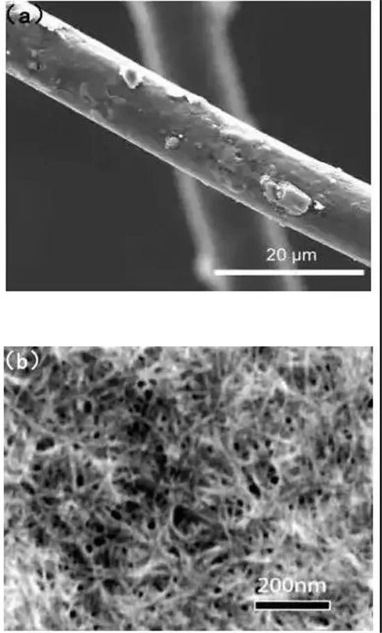 (a)PBO原纖維;(b)PBO納米纖維隔膜結(jié)構(gòu)